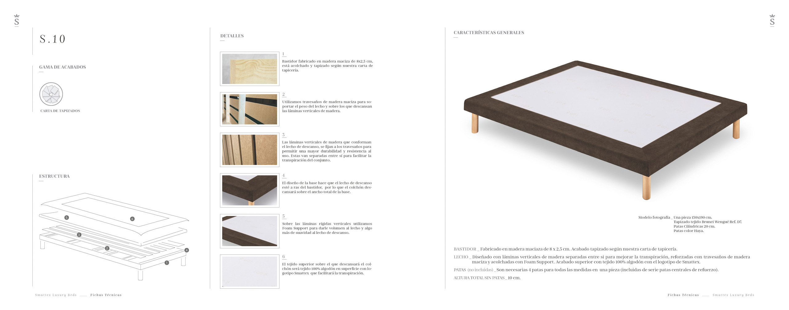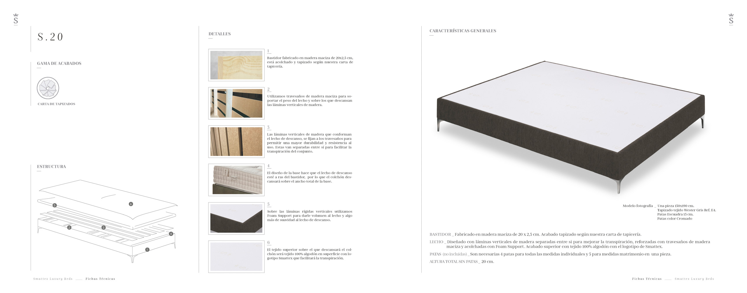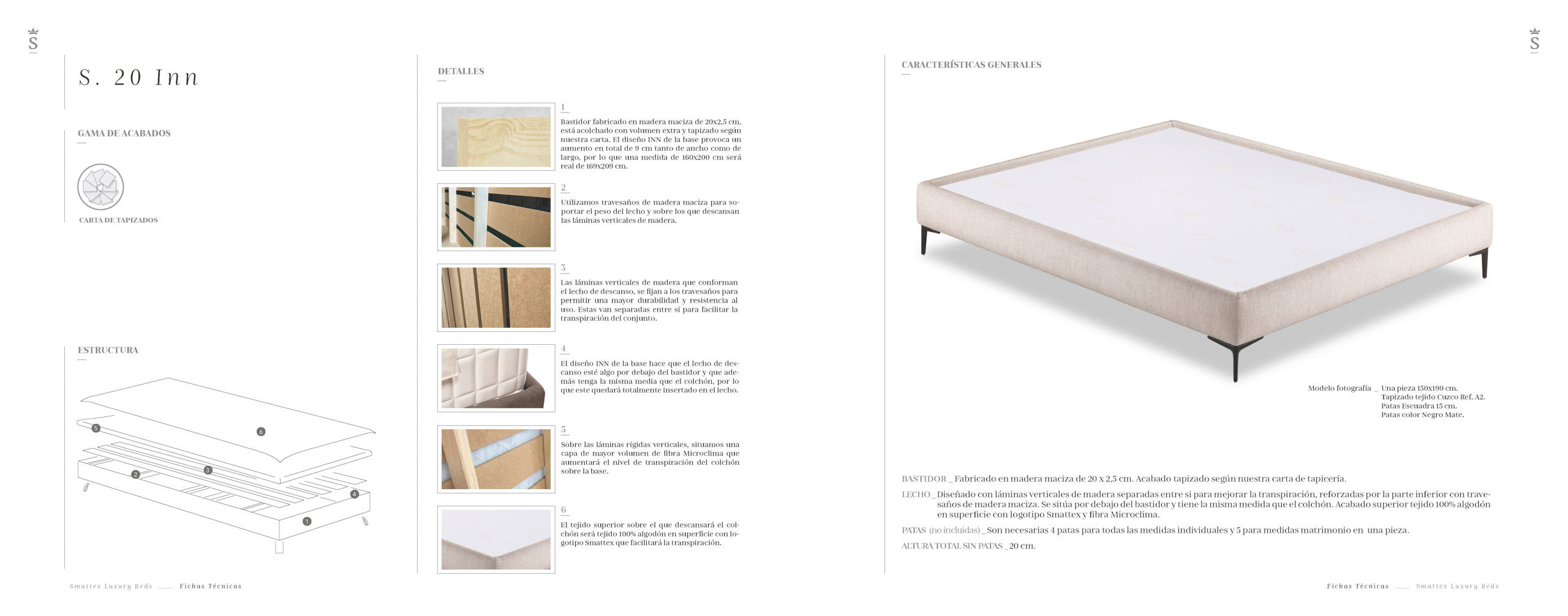 BASTIDOR _ Fabricado en madera maciza de 20 x 2,5 cm. Acabado tapizado según nuestra carta de tapicería. LECHO _ Diseñado con láminas verticales de madera separadas entre si para mejorar la transpiración, reforzadas por la parte inferior con travesaños de madera laminada. Se sitúa por debajo del bastidor y tiene la misma medida que el colchón. Acabado superior tejido 100% algodón en superficie con logotipo Smattex y fibra Microclima. PATAS (no incluidas) _ Son necesarias 4 patas para todas las medidas individuales y 5 para medidas matrimonio en una pieza. ALTURA TOTAL SIN PATAS _ 20 cm.