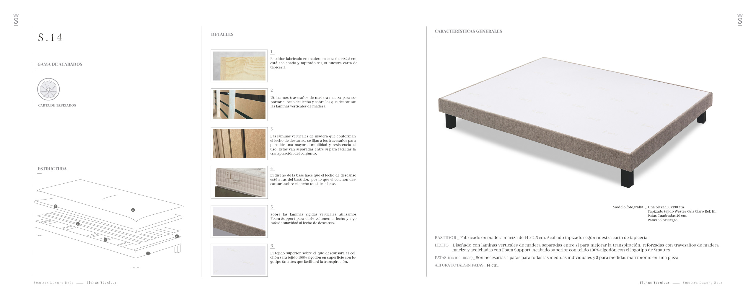BASTIDOR _ Fabricado en madera maciza de 14 x 2,5 cm. Acabado tapizado según nuestra carta de tapicería. LECHO _ Diseñado con láminas verticales de madera separadas entre si para mejorar la transpiración, reforzadas con travesaños de madera laminada y acolchadas con Foam Support. Acabado superior con tejido 100% algodón con el logotipo de Smattex. PATAS (no incluidas) _ Son necesarias 4 patas para todas las medidas individuales y 5 para medidas matrimonio en una pieza. ALTURA TOTAL SIN PATAS _ 14 cm.