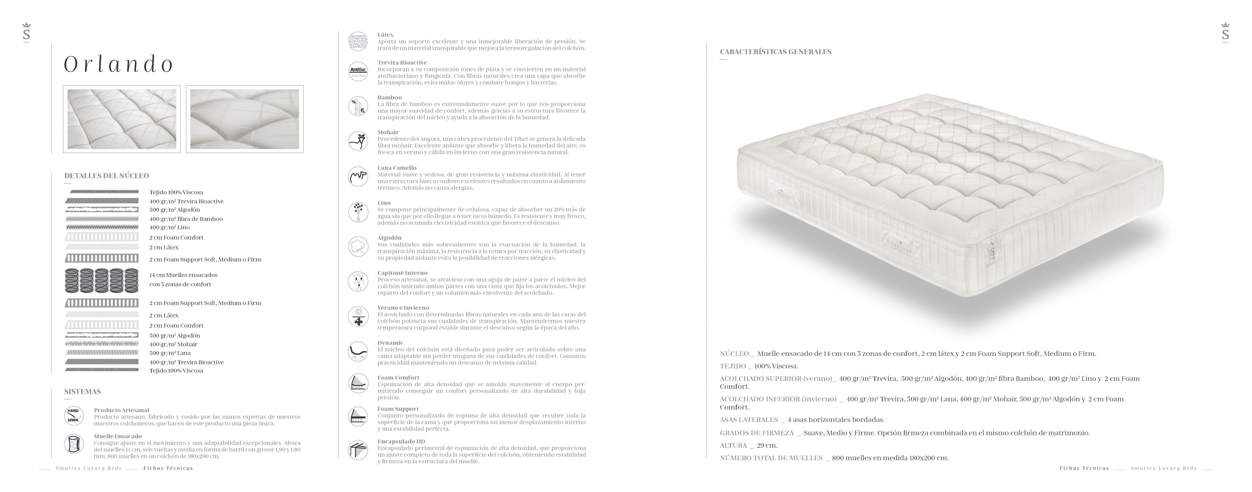 NÚCLEO _ Muelle ensacado de 14 cm con 3 zonas de confort, 2 cm látex y 2 cm Foam Support Soft, Medium o Firm. TEJIDO SUPERIOR _ 100% Viscosa. ACOLCHADO SUPERIOR (verano) _ 400 gr/m2 Trevira Bioactive, 500 gr/m2 Algodón, 400 gr/m2 fibra Bamboo, 400 gr/m2 Lino y 2 cm Foam Comfort. ACOLCHADO INFERIOR (invierno) _ 400 gr/m2 Trevira Bioactive, 500 gr/m2 Lana, 400 gr/m2 Mohair, 500 gr/m2 Algodón y 2 cm Foam Comfort. ASAS LATERALES _ 4 asas horizontales bordadas. GRADOS DE FIRMEZA _ Suave, Medio y Firme. Opción firmeza combinada en el mismo colchón de matrimonio. ALTURA _ 29 cm. NÚMERO TOTAL DE MUELLES _ 800 muelles en medida 180x200 cm.