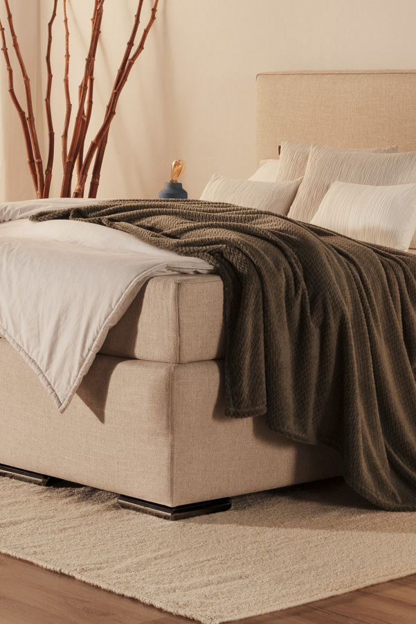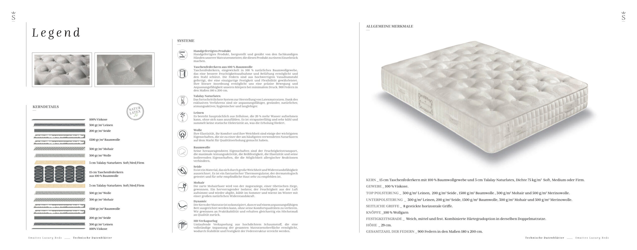 KERN _ 15 cm Taschenfederkern mit 100 % Baumwollgewebe und 3 cm Talalay-Naturlatex, Dichte 75 kg/m3 Soft, Medium oder Firm. GEWEBE _ 100 % Viskose. TOP POLSTERUNG _ 300 g/m2 Leinen, 200 g/m2 Seide , 1500 g/m2 Baumwolle , 300 g/m2 Mohair und 500 g/m2 Merinowolle. UNTERPOLSTERUNG _ 300 g/m2 Leinen, 200 g/m2 Seide, 1500 g/m2 Baumwolle, 300 g/m2 Mohair und 500 g/m2 Merinowolle. SEITLICHE GRIFFE _ 8 gestickte horizontale Griffe. KNÖPFE _100 % Wollgarn. FESTIGKEITSGRADE _ Weich, mittel und fest. Kombinierte Härtegradoption in derselben Doppelmatratze. HÖHE _ 29 cm. GESAMTZAHL DER FEDERN _ 900 Federn in den Maßen 180 x 200 cm.
