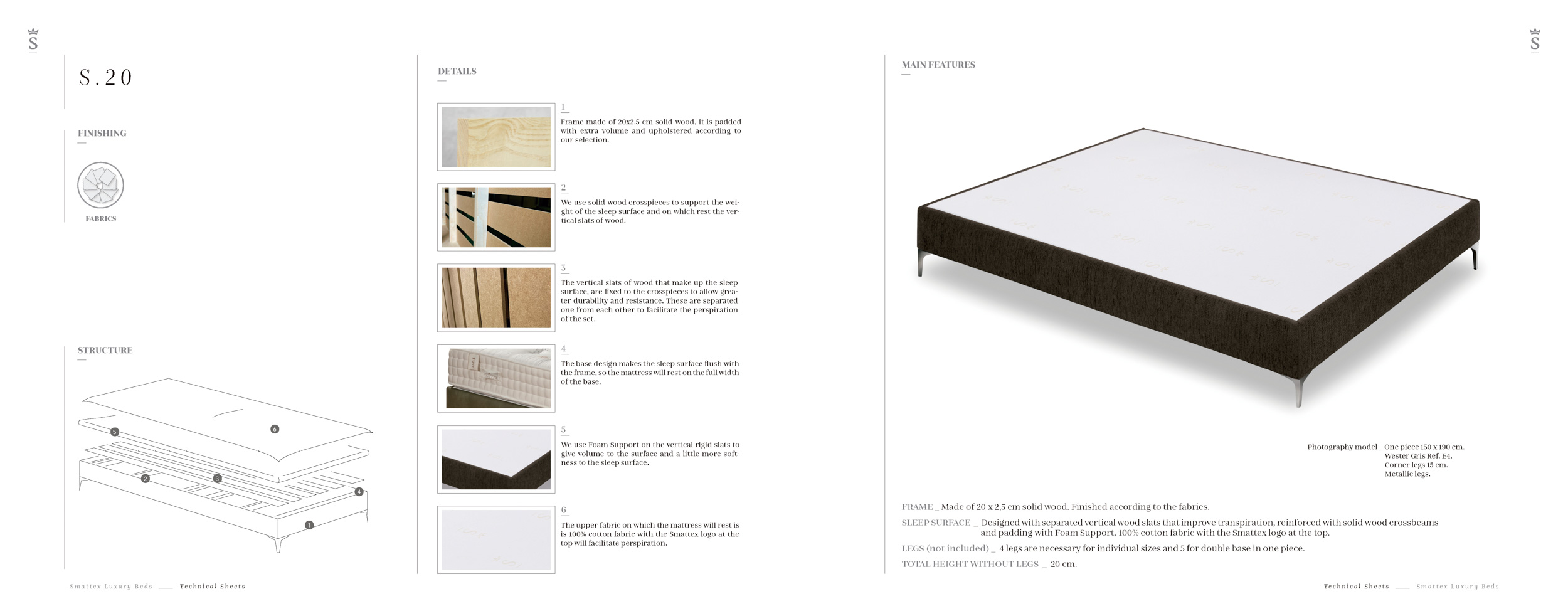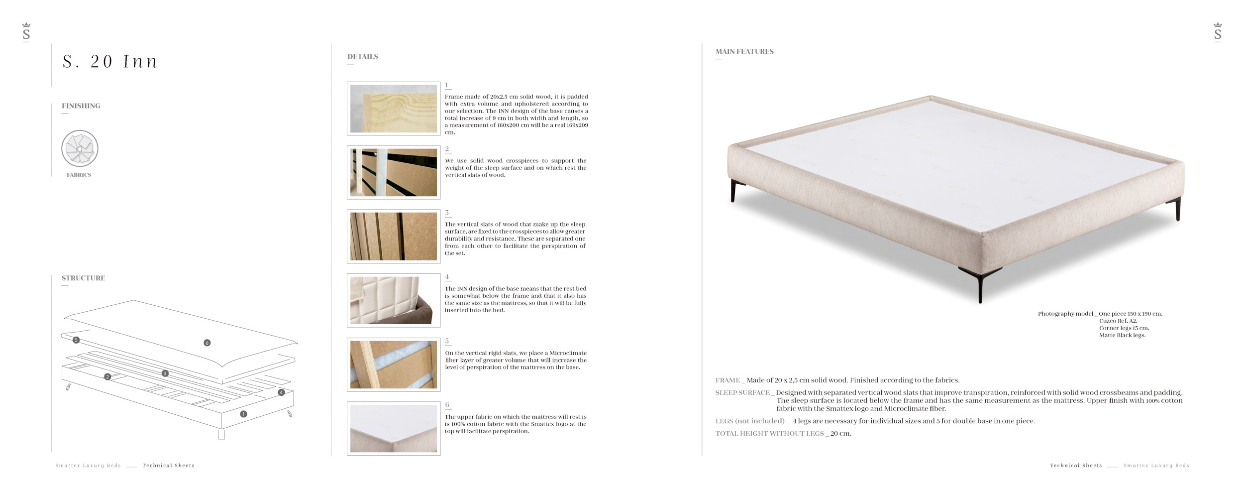 FRAME _ Made of 20 x 2,5 cm solid wood. Finished according to the fabrics. SLEEP SURFACE _ Designed with separated vertical wood slats that improve transpiration, reinforced with laminated wood crossbeams and padding with Foam Support. 100% cotton fabric with the Smattex logo at the top. LEGS (not included) _ 4 legs are necessary for individual sizes and 5 for double base in one piece. TOTAL HEIGHT WITHOUT LEGS _ 20 cm.