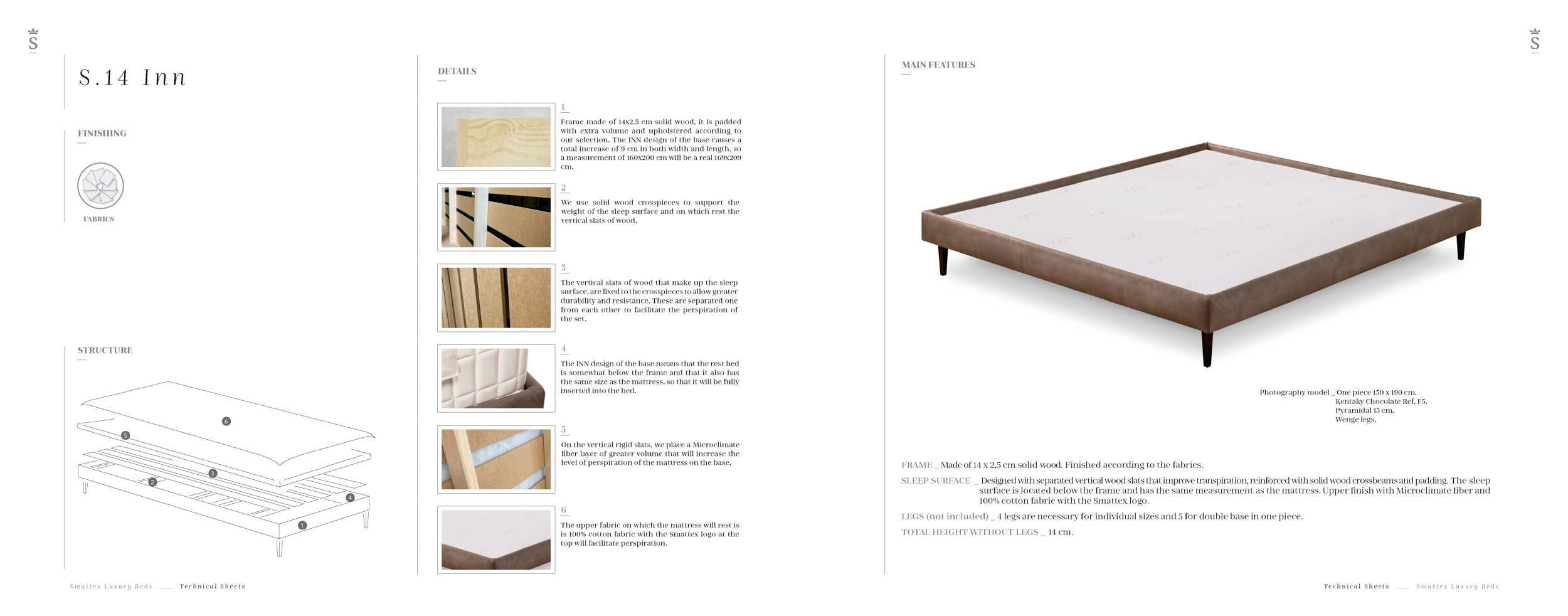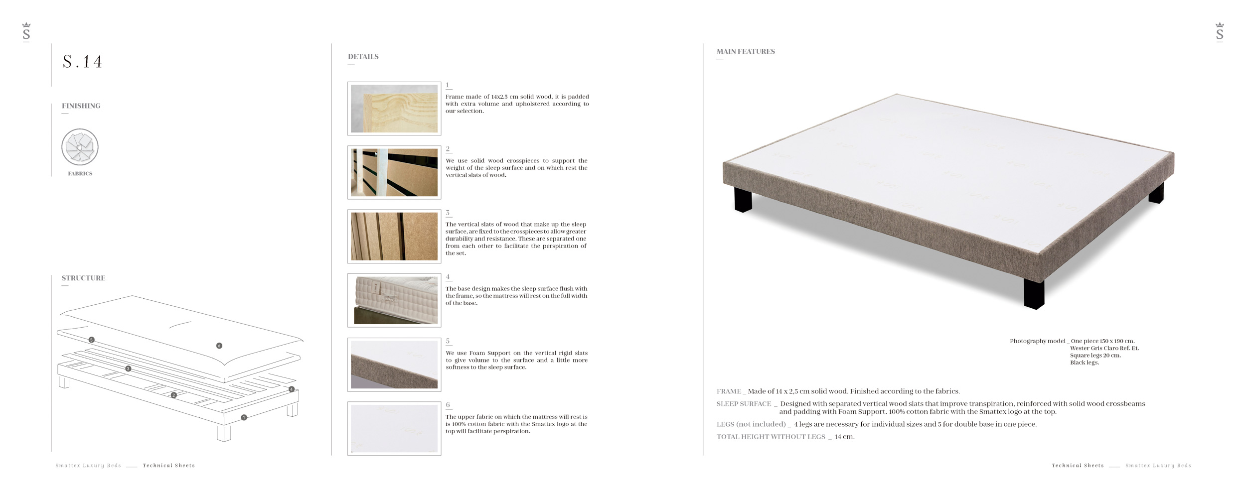 FRAME _ Made of 14 x 2,5 cm solid wood. Finished according to the fabrics. SLEEP SURFACE _ Designed with separated vertical wood slats that improve transpiration, reinforced with laminated wood crossbeams and padding with Foam Support. 100% cotton fabric with the Smattex logo at the top. LEGS (not included) _ 4 legs are necessary for individual sizes and 5 for double base in one piece. TOTAL HEIGHT WITHOUT LEGS _ 14 cm.