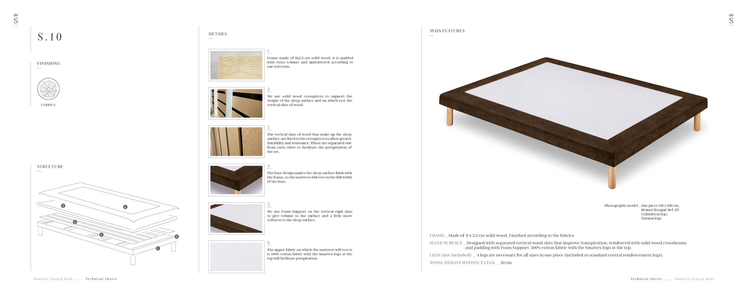 FRAME _ Made of 8 x 2,5 cm solid wood. Finished according to the fabrics. SLEEP SURFACE _ Designed with separated vertical wood slats that improve transpiration, reinforced with laminated wood crossbeams and padding with Foam Support. 100% cotton fabric with the Smattex logo at the top. LEGS (not included) _ 4 legs are necessary for all sizes in one piece (included as standard central reinforcement legs). TOTAL HEIGHT WITHOUT LEGS _ 10 cm.