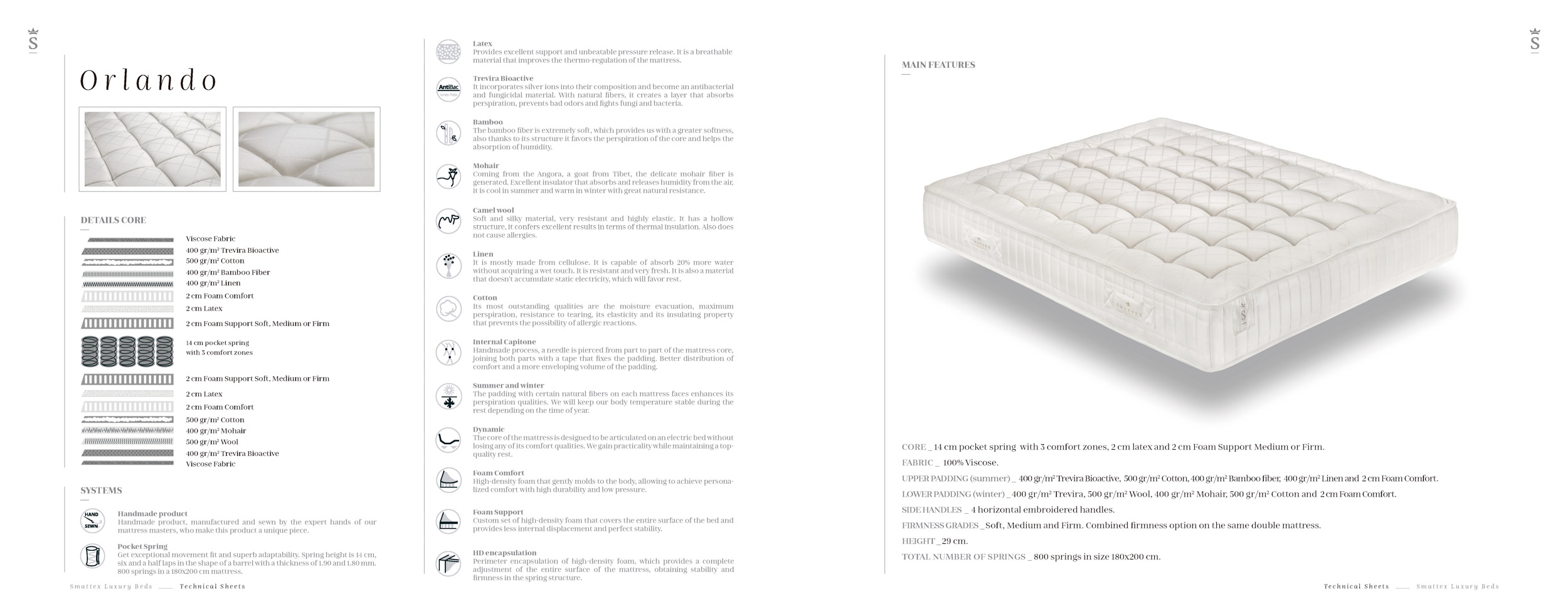 CORE _ 14 cm pocket spring with 3 comfort zones, 2 cm latex and 2 cm Foam Support Soft, Medium or Firm. FABRIC_ 100% Viscose. UPPER PADDING (summer)_ 400 gr/m2 Trevira Bioactive, 500 gr/m2 Cotton, 400 gr/m2 Bamboo fiber, 400 gr/m2 Linen and 2 cm Foam Comfort. LOWER PADDING (winter) _ 400 gr/m2 Trevira, 500 gr/m2 Wool, 400 gr/m2 Mohair, 500 gr/m2 Cotton and 2 cm Foam Comfort. SIDE HANDLES _ 4 horizontal embroidered handles. FIRMNESS GRADES _ Soft, Medium and Firm. Combined firmness option on the same double mattress. HEIGHT _ 29 cm. TOTAL NUMBER OF SPRINGS _ 800 springs in size 180x200 cm.